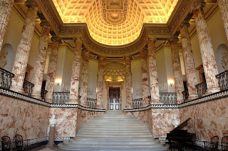 Above, the Marble Hall at Holkham Hall in Norfolk, the estate of the earls of Leicester. On either side of the staircase (on the right behind the piano) are two busts by Sir Francis Legatt Chantrey.