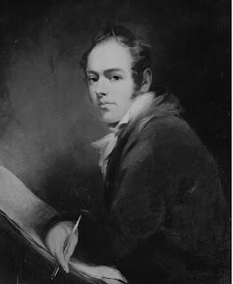 Also in the Royal Collection is this watercolour on ivory by Andrew Robertson (1777-1845), dated 1800. Purchased by Queen Victoria in 1880, it portrays Chantrey “Half-length, standing, facing slightly to the right, wearing a grey studio coat and dark blue waistcoat and holding a hammer, chisel and yellow dustcloth, beside his bust of George IV; grey-blue eyes, grey-brown hair; red curtains background.”