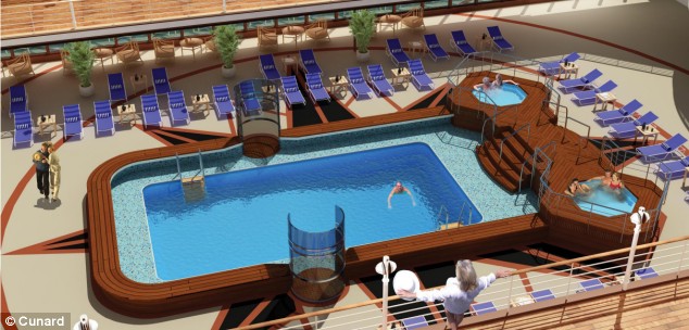Cunard’s President and Managing Director, Peter Shanks, says: “We needed to fill that space with something which would not just be dramatic but which would also reflect our emphasis on traditional and sumptuous materials. After much thought and exploratory work, it was decided to commission a 5.6-metre (18 ft 6 in) high marquetry panel depicting the original Queen Elizabeth, an Art Deco icon, using a variety of natural woods from around the world.