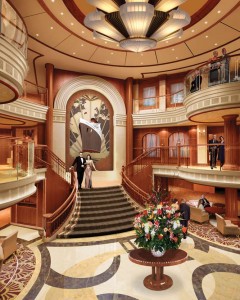 Cunard ships, while among the most modern afloat, are known for their traditional luxury, accentuated by extensive use of brass, classic fabrics, marble and highly polished woods. One challenge for Queen Elizabeth’s designers was how to treat the significant central space on the sweeping staircase in the ship’s soaring Grand Lobby.