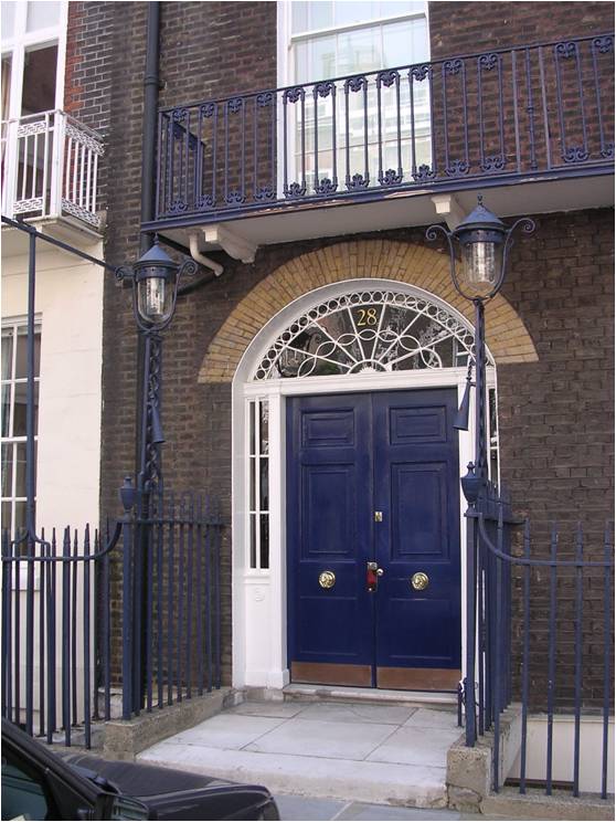 house in a row of 18th century buildings. It shows the torch snuffers on the lamp poles, for the footmen to extinguish their guiding torches after travel at night. Also, the fan light above the door would serve as an address before there were numbers on the houses. The picture of the unique fan light would be shown on your invitation to identify the proper venue!