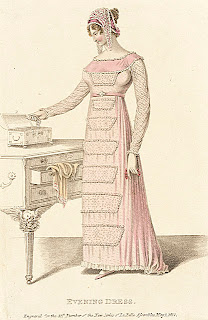 A superfine Scotch or French cambric, over a cambric slip, with full long sleeves, and ruff à la Mary Queen of Scots. A neck-chain and sight set in gold; bracelets and necklace of white or red cornelian. A Flora cap, composed of white satin and lace. A capuchin or French cloak of blossom satin or Pomona green, trimmed with thread lace. Slippers of pale pink or green kid; and gloves of tan or Limerick kid.