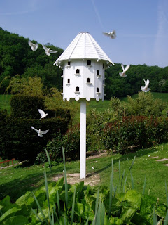 The Branscombe model dovecote, above, available from http://www.dovecotes.co.uk/, offers four storeys of living space for 20 to 24 pair of doves. No doves? No problem . . . . whilst called “dovecotes” these houses have always been used to more commonly house pigeons.