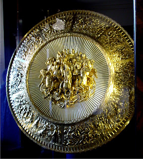 “This is where Wellington held the Waterloo Banquet every year on the anniversary of the battle. Wellington would invite all the officers who’d fought with him, and George IV, who only thought he’d fought with him. And that silver centerpiece was given to Wellington by the Portuguese to commemorate Wellington’s victories in the Peninsular Wars. It’s the one I touched and set off the alarms.”