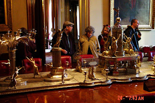 “This is where Wellington held the Waterloo Banquet every year on the anniversary of the battle. Wellington would invite all the officers who’d fought with him, and George IV, who only thought he’d fought with him. And that silver centerpiece was given to Wellington by the Portuguese to commemorate Wellington’s victories in the Peninsular Wars. It’s the one I touched and set off the alarms.”