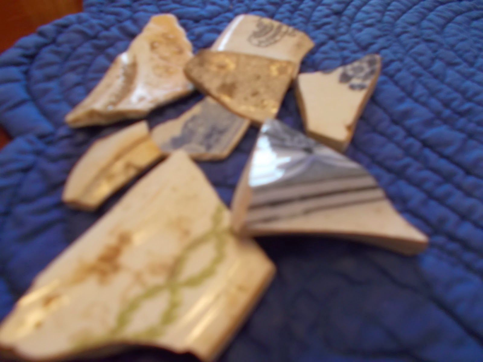Victoria’s treasures were much prettier and are pictured above: shells, clay pipe stem, blue-and-white shards, tile pieces.