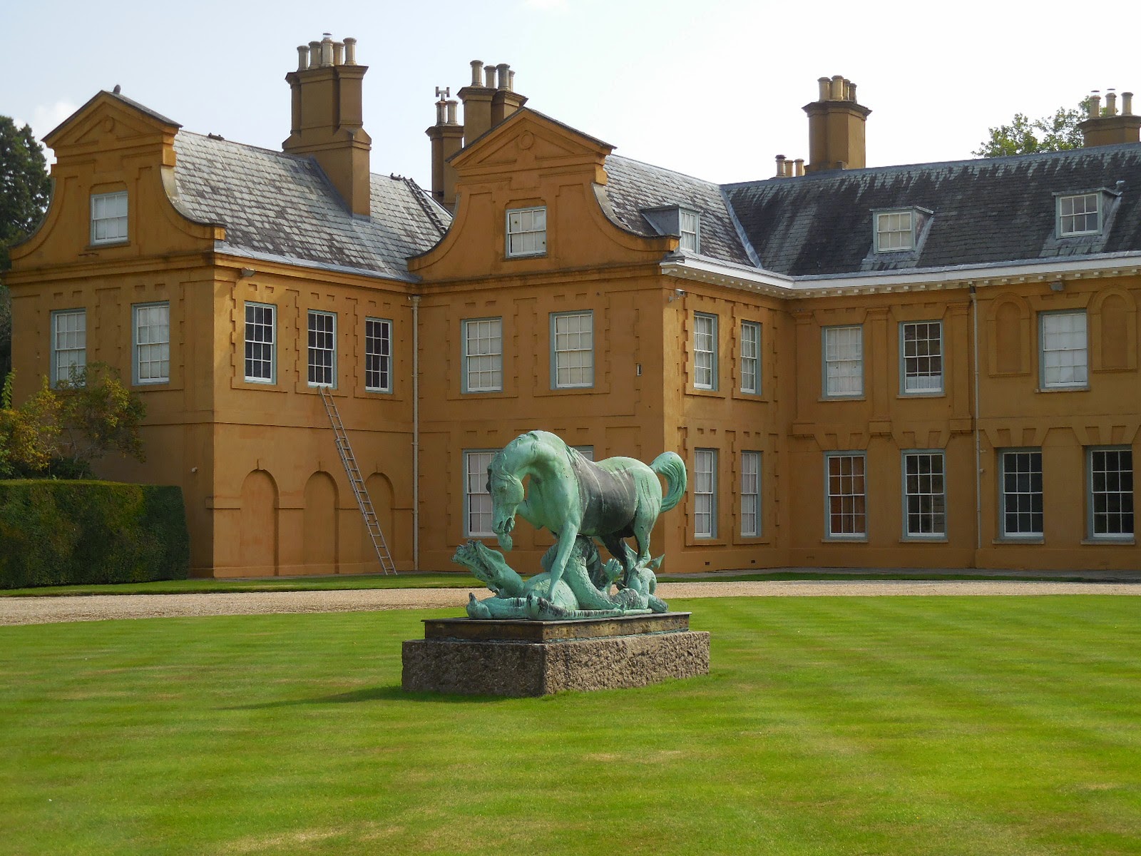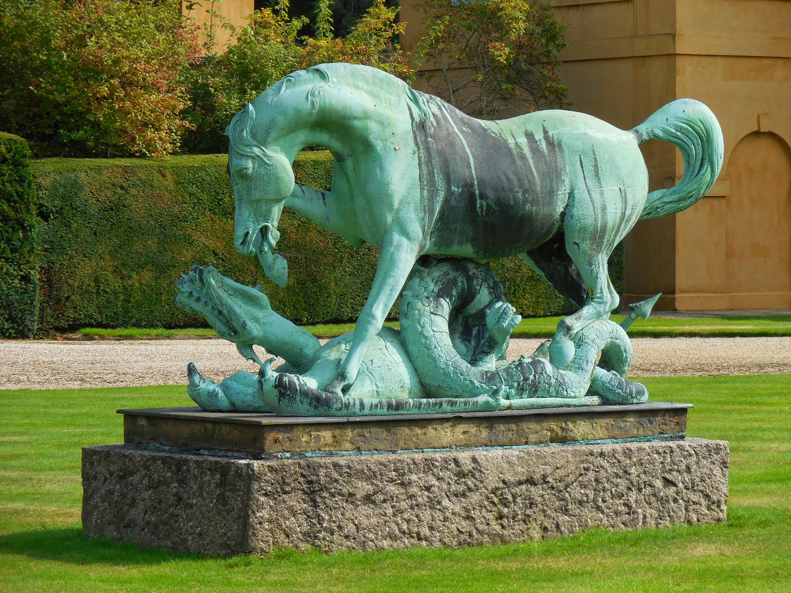 The bronze statue is that of a horse trampling a dragon. This bronze is missing St George. It was initially commissioned by George IV for St George’s Hall, Windsor, but wasn’t completed before the King’s death. It was bought by the second Duke of Wellington for £750 in 1865. It is now Grade II listed.