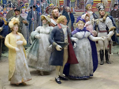 All the figures were researched from portraits in the Royal Collection. Princess Augusta is on the left in yellow, plump Princess Elizabeth is in blue, with the Duke of Kent, Queen Victoria’s father behind her, Princess Sophia is in pink with the really bad sheep of the family, the swaggering Ernest Duke of Cumberland at her side in uniform (he was believed to harbour incestuous thoughts about his sister Sophia and less than a year later suspected of killing his valet.) The Duke of Sussex is behind him. The royal party graciously partook of slices of the meat served on silver dishes, before retiring to the garden at the back for a ‘cold collation.’