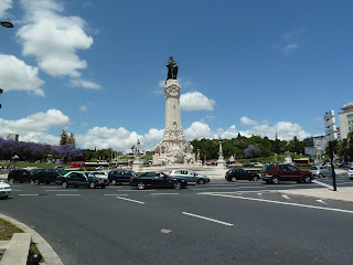 Victoria here, writing from Lisbon, where it is sunny and delightfully breezy. Above, the statue of Marquis de Pombal, at the foot of Parque Eduardo VII, named for the British King who visited here in 1903 to confirm the continuing alliance of Portugal and the United Kindom. Below, the view from the top of the park, looking down toward the statue, the broad tree-lined boulevard beyond it, to the River Tagus.